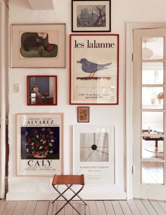 Using 3 or more different frame types can still look unified if the the gallery is less structured. Using similar artwork or colours in the work helps create a cohesive look too.
